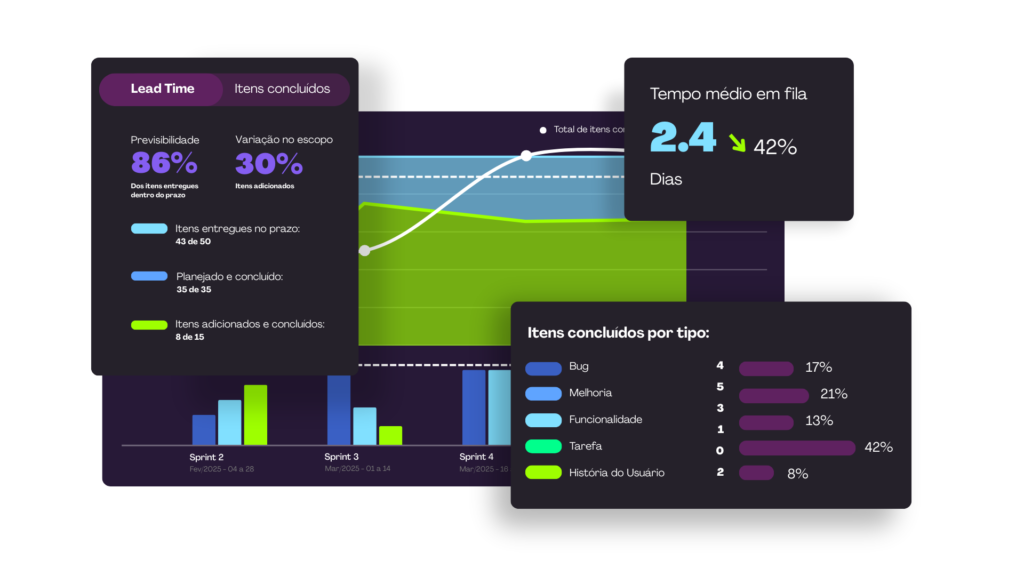 Setup realizado para cada cliente com as métricas alinhadas de performance para acompanhamento das taxas de produtividade e eficiência do time e de cada profissional, customizadas por projeto